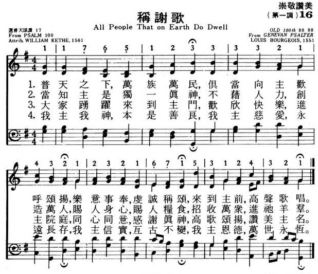按《三一颂》调乃布儒瓦为日内瓦诗篇第100篇所谱的,所以至今仍通称为《老100篇》。