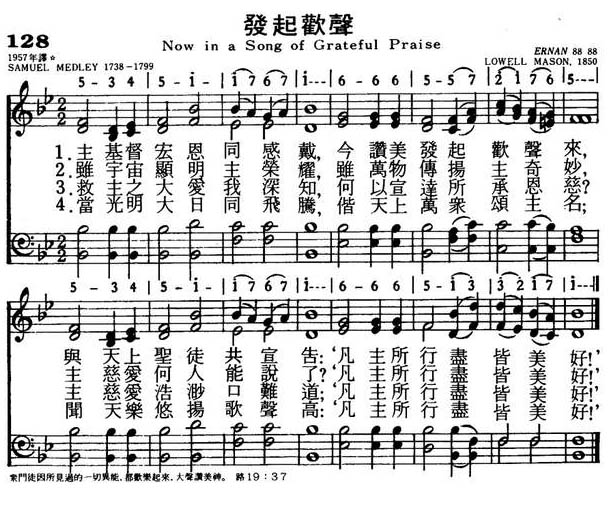 1.主基督宏恩同感戴,今赞美发起欢声来,