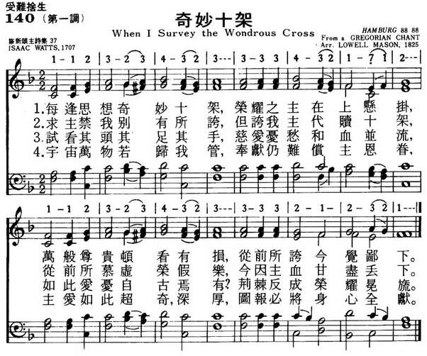 1.每逢思想奇妙十架,荣耀之主在上悬挂,