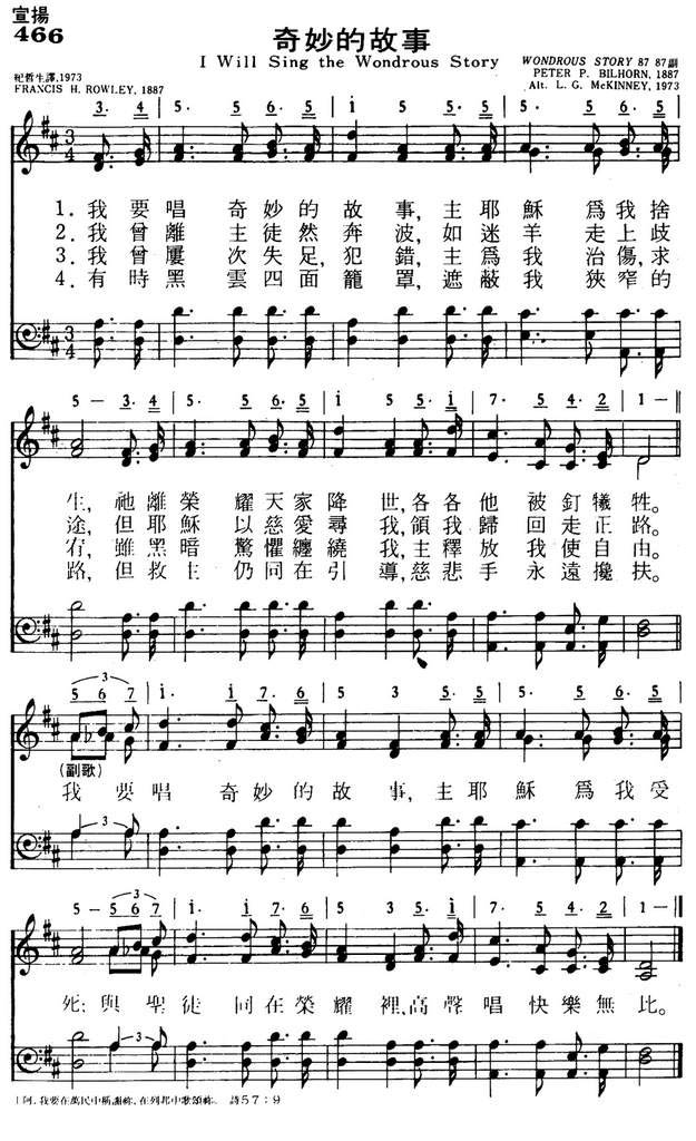 《奇妙的故事》由Rowley写词,Bilhorn谱曲。这首诗歌收录于《福音诗集》,后来又收录在新版的《圣歌独唱曲集》。歌曲写于1886年大复兴风潮中,当年Rowley在麻省第一浸信会已牧会三年,他曾提及写这歌的经过:我当年有一位得力助手,他叫Bilhorn,来自瑞士,是年轻的音乐家。某个主日晚间崇拜后,Bilhorn对我说:“你可以写诗让我谱曲啊。”当晚我脑海突然出现《奇妙的故事》一诗。原来诗歌的起句是:怎不唱这奇妙故事?后来1887年散基的诗集编辑把这一句改为:我要唱奇妙的故事。
