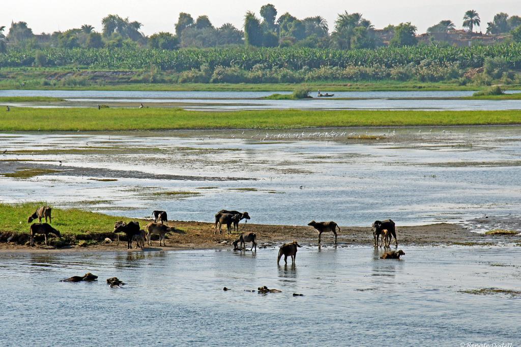上图:在尼罗河放牧的牛。