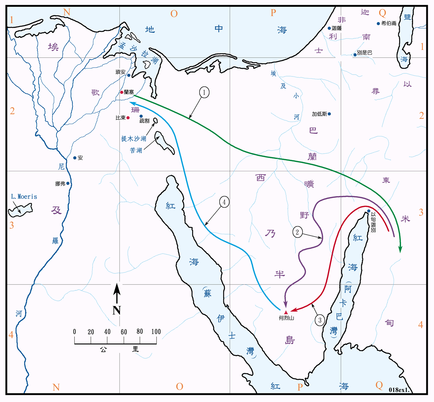 上图:摩西早年行踪:1、摩西逃往米甸,与祭司流珥的女儿西坡拉结婚(出二11-22);2、摩西到何烈山牧羊时,神向他显现,差遣他领以色列人出埃及(出三1-四17)。3、摩西一家启程回埃及,到了何烈山(出四18-26);4、亚伦到何烈山迎接摩西,一同回到埃及(出四27-31)。
