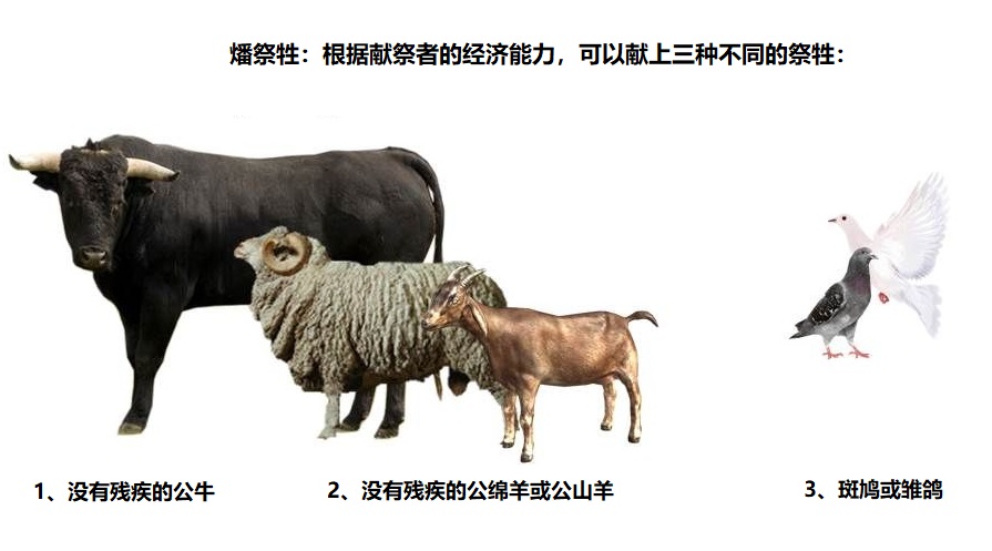 上图:燔祭的祭牲。根据献祭者的经济能力,可以献上3种祭牲,但都必须是公的。只有鸟没有要求。