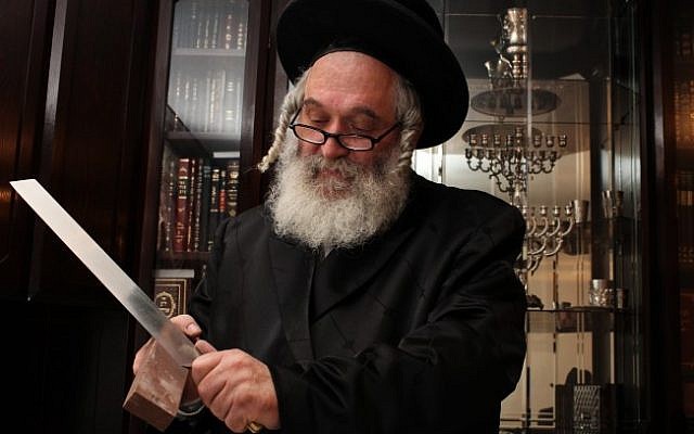 上图:一位拉比正在磨刀。符合犹太屠宰法(Shechita)的刀具被称为Sakin或Hallaf。这刀大约要比被屠宰牲畜的脖子宽两倍,刀刃不可有任何缺口,并且要锋利到牲畜来不及感到疼懂的程度。如果屠宰之后,拉比发现刀具不符合以上要求,所屠宰的牲畜就不可食用。因此,犹太人不可随便宰杀牲畜,通常都由拉比担任屠夫,而肉食工厂都有驻场拉比,按犹太律法对每一个环节进行严格的Kosher认证。