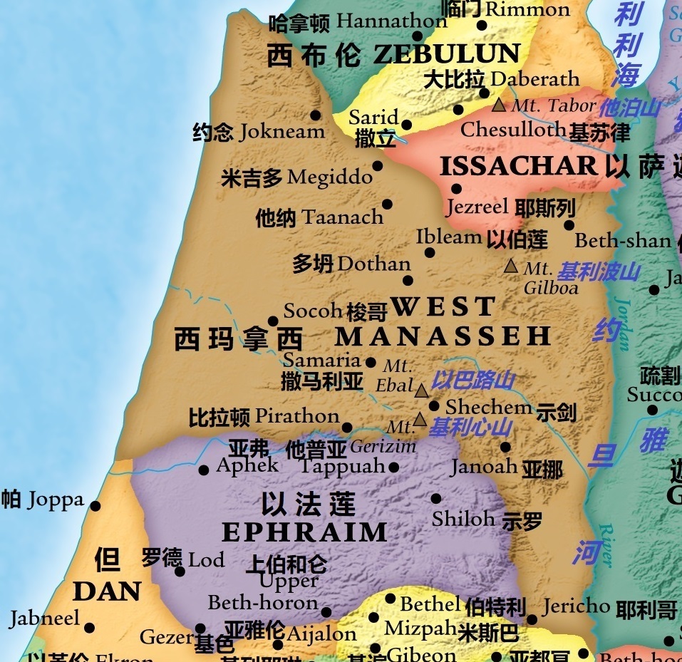 上图:以法莲支派和玛拿西河西半个支派所分得的地业。