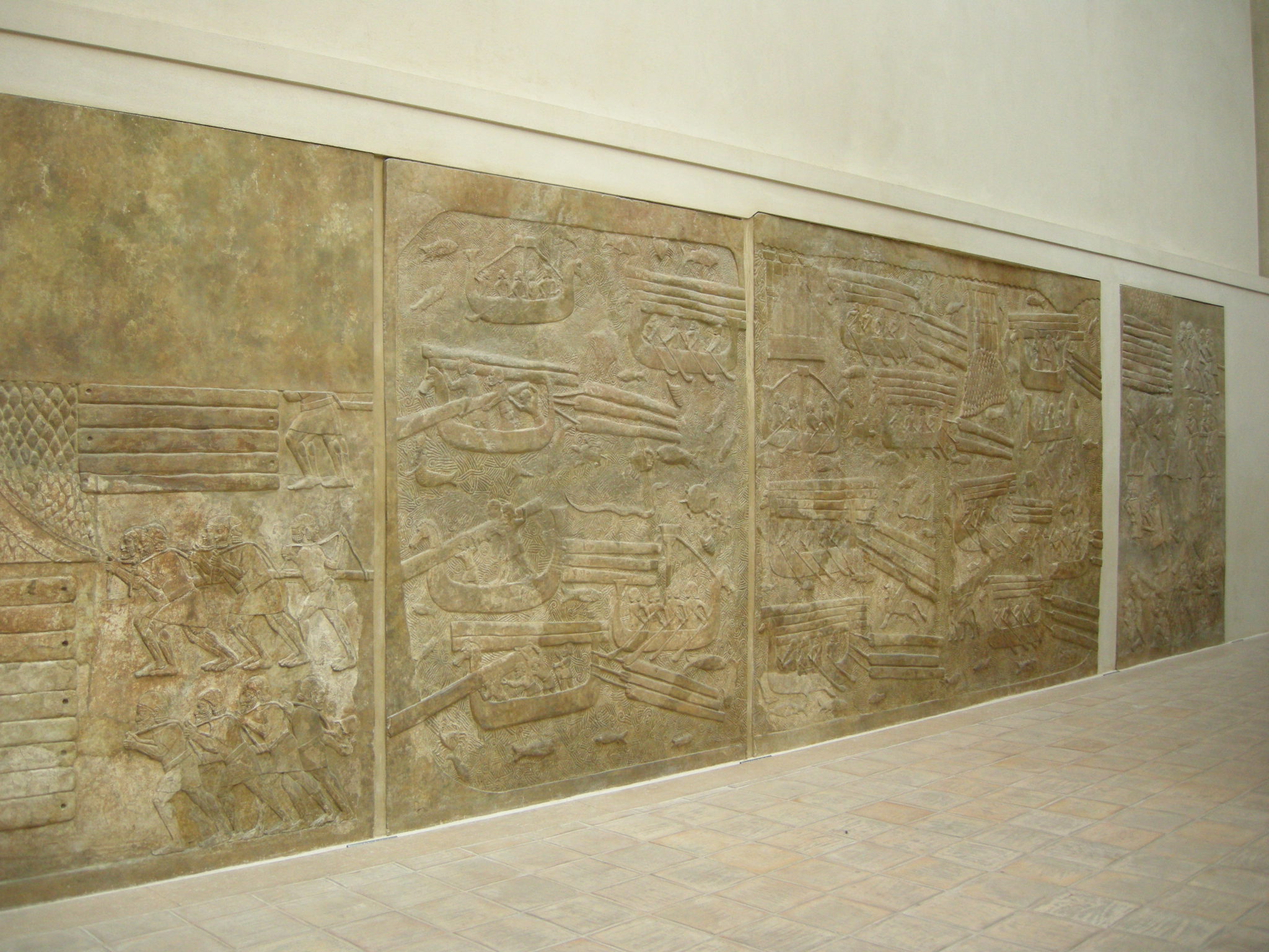 上图:主前716-713年的亚述浮雕,用一系列生动的画面描绘了腓尼基人装载、海运和卸载黎巴嫩的香柏木,用以建造亚述王的宫殿。在所罗门和所罗巴伯的时代,推罗人也用同样的方法为建造圣殿提供香柏木。出土于杜尔·沙鲁金(Dar Sharrukin)亚述王撒珥根二世(Sargon II,主前722-705年在位)的宫殿,收藏于卢浮宫。