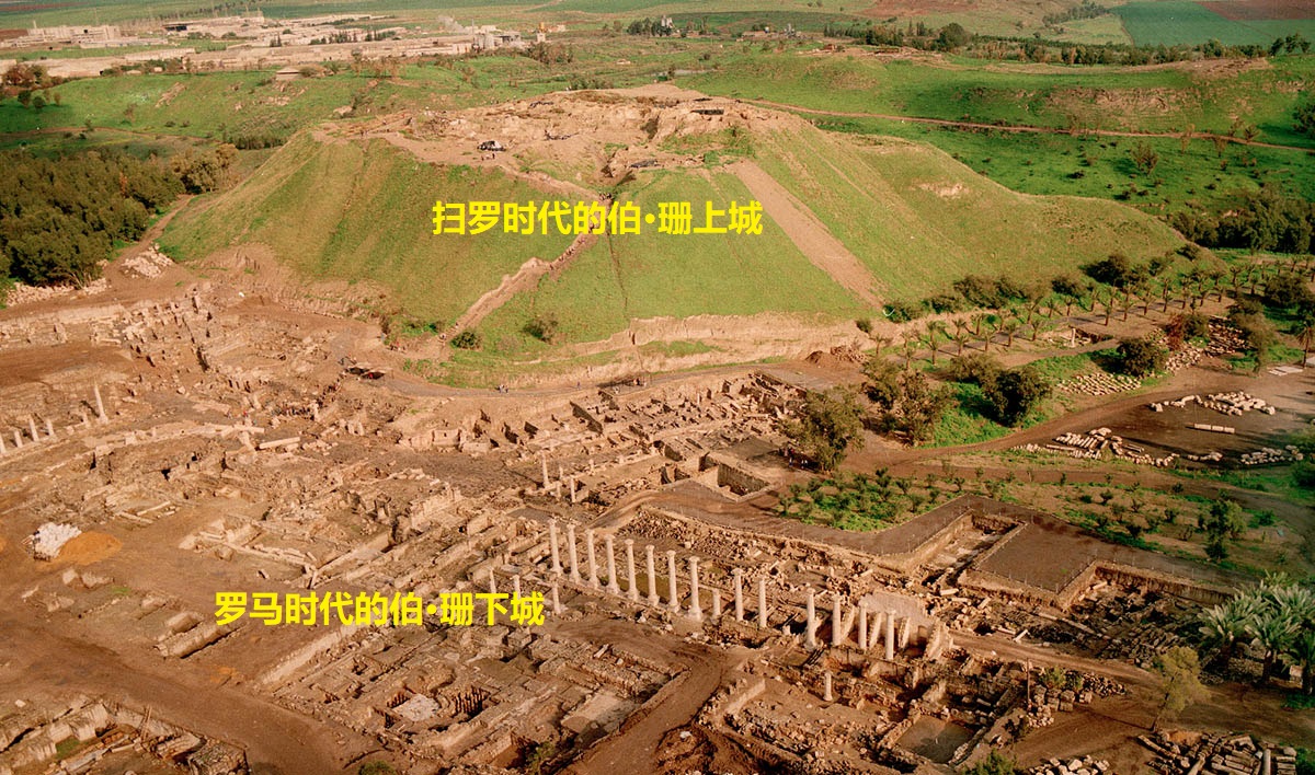上图:伯·珊遗址,分为上城和下城,位于海平面以下120米,东面5公里就是海平面以下275米的约旦河谷。上城建在一个大土岗上,青铜时代晚期是埃及统治迦南北部的行政中心。罗马庞贝将军在主前63年重建伯·珊下城,成为低加波利地区的首府,直到主后749年毁于地震。