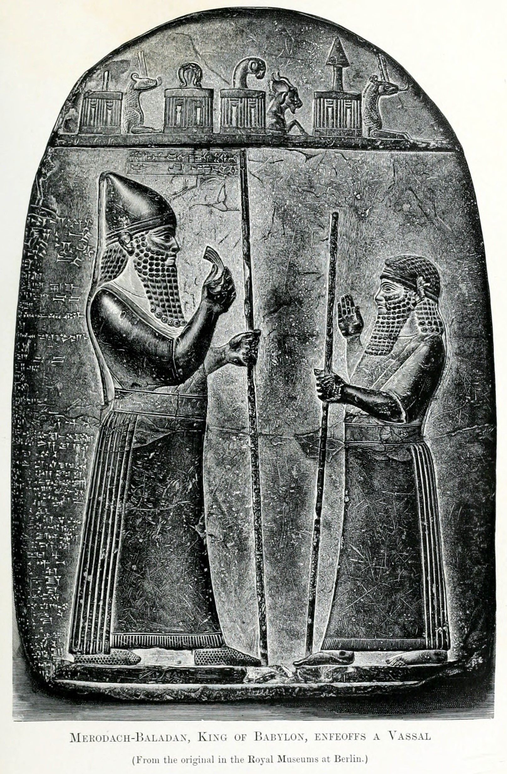 上图:玛尔杜克·巴拉丹界碑,描绘巴比伦王玛尔杜克·巴拉丹二世(Merodach-Baladan II,主前721-710年、703-702年在位)正在赐给一位藩属王封地。