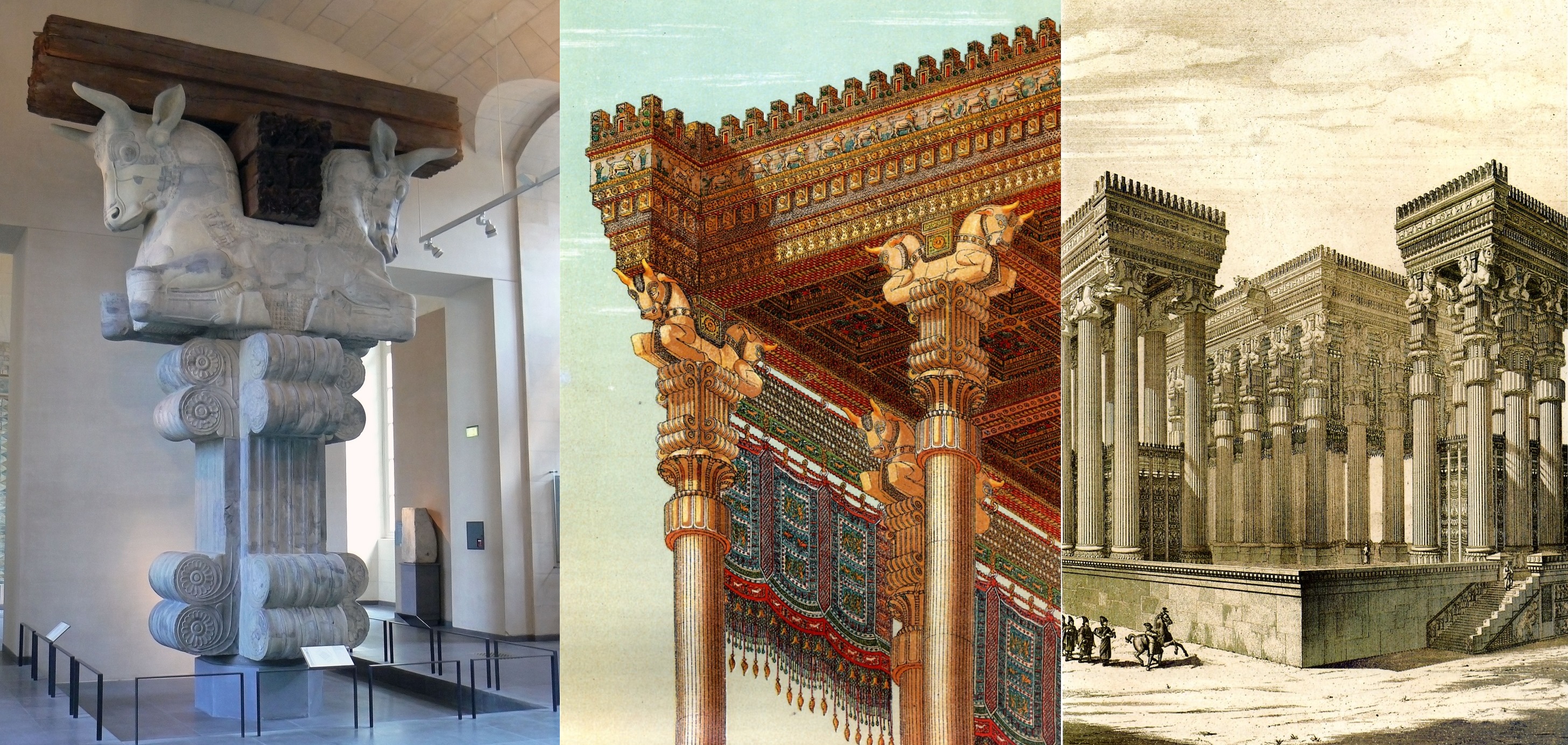 上图:书珊城波斯王宫大厅里的巨大圆柱顶,由希腊和吕底亚的石匠雕刻而成,现存于卢浮宫。大流士一世把书珊城作为帝国的行政首都,在三个高坡上建造了一座美索不达米亚式的宫殿建筑群,从北部俯瞰城市。王宫入口处有一个109平方米的宏伟大厅(apadana),有36个21米高的圆柱,每个都由刻着国王名字的方形底座和爱奥尼亚式立柱组成。柱顶包括:埃及的棕叶篮饰,以弗所亚底米神庙的双玫瑰结双蜗壳,美索不达米亚象征宇宙平衡的两只公牛,屋梁搁在背对背跪着的公牛脖子之间。这个柱顶有意结合了来自波斯帝国境内三大文明的元素,以展示帝国的统一。