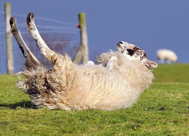 上图:在牧场上经常会看到绵羊四脚朝天躺在地上,通常是因为滑倒、过肥、过重或怀孕。绵羊无法自己翻身,它会一直躺在地上,直到成为食肉动物的猎物。即使没有猛兽,绵羊胃里的草也会发酵产生气体,躺倒的羊无法排出胃里的气体,最后气体压迫肺,使绵羊窒息而死。因此,这时需要有人帮助它翻转过来。绵羊翻身以后,可能会晕一会儿,然后就会跑到其它同伴中间。正如诗二十三3所说:「祂使我的灵魂苏醒」。
