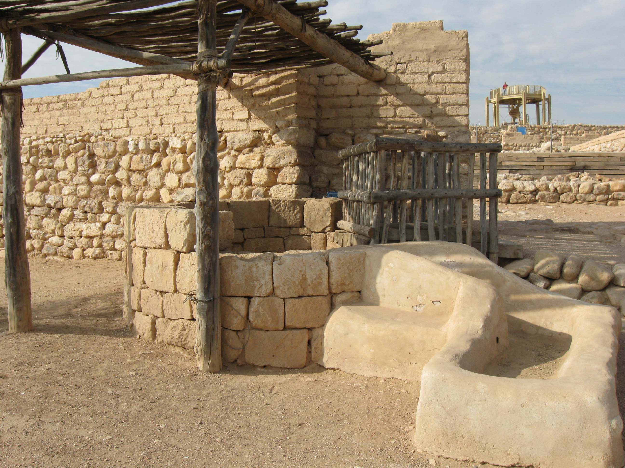 上图:别是巴遗址城门口的公共水井,深70米,是在南地已发现最深的水井。很可能就是以撒所挖的井。古代的中东公共水井一般在村口或城门口,以方便牲口喝水,通常带有一个饮水槽。别是巴遗址位于一条旱溪旁边,旱溪冬天被雨水充满,夏天水存于地下,因此附近有多个水井。别是巴从主前4000年开始就存在了,现有遗迹是按主前8世纪的样式恢复的,外围的泥砖墙是主前10世纪开始的,城内可居住400名军人和公务员,农夫们住在城外的村庄里。