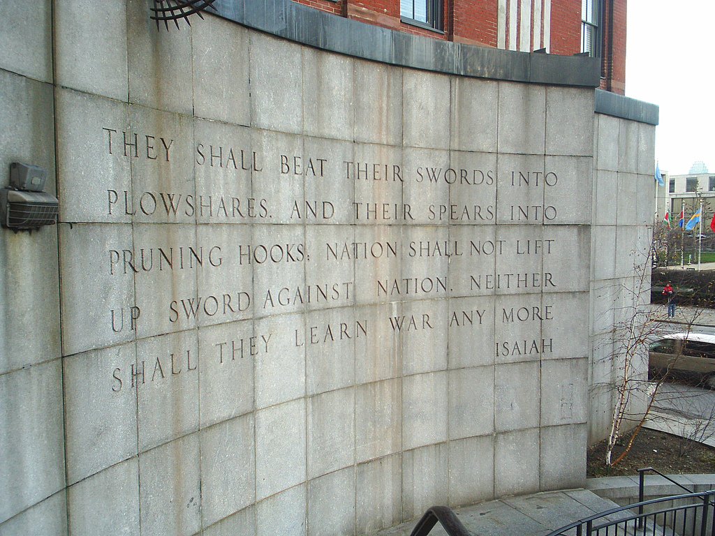 上图:纽约联合国大厦对面Ralph Bunche公园里的「以赛亚墙」,上面刻着「他们要将刀打成犁头,把枪打成镰刀。这国不举刀攻击那国;他们也不再学习战事」(赛二4;弥四3)。这句话表达了人类盼望和平的美好愿望,但却故意不写前面一句:「祂必在列国中施行审判,为许多国民断定是非」(赛二4)。世人要和平、却不要赐和平的神,所以和平的美好愿望注定只是一场美梦。