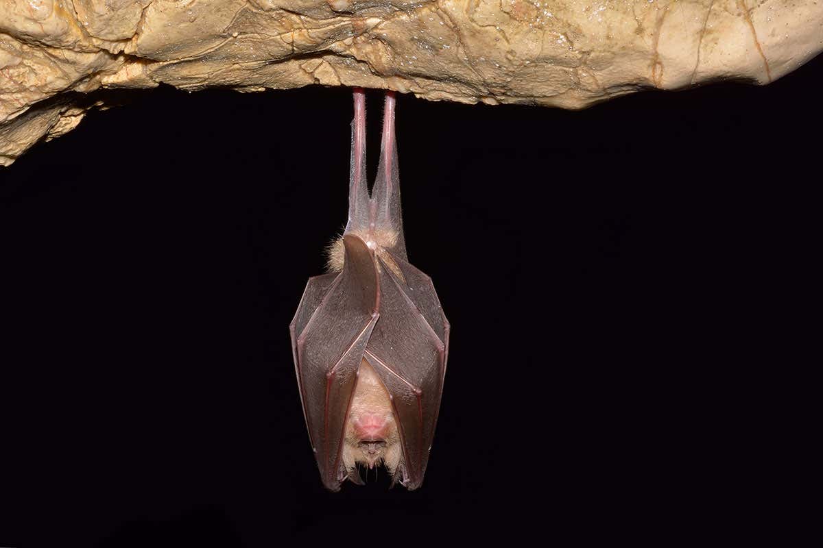 上图:一只倒挂在黑暗洞穴中的蝙蝠。蝙蝠是会飞行的哺乳动物,寿命长、体温高,可以携带大量致命病毒、但却很少发病,所以成为许多病毒的理想宿主,包括埃博拉、SARS、MERS和COVID-19等。当人类侵入蝙蝠的生活空间时,这些病毒就有可能直接或间接地传染给人。