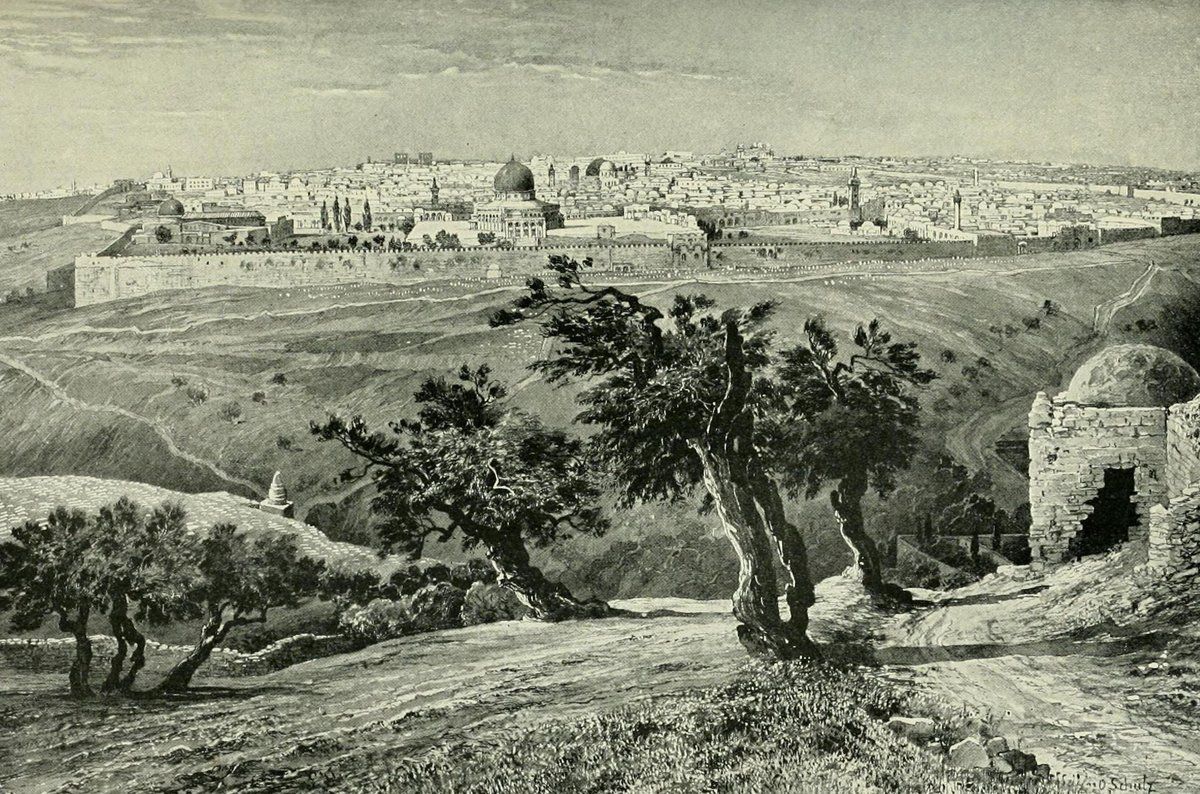 上图:一幅十九世纪的画,从橄榄山顶向西俯瞰奥斯曼帝国时代的耶路撒冷城。