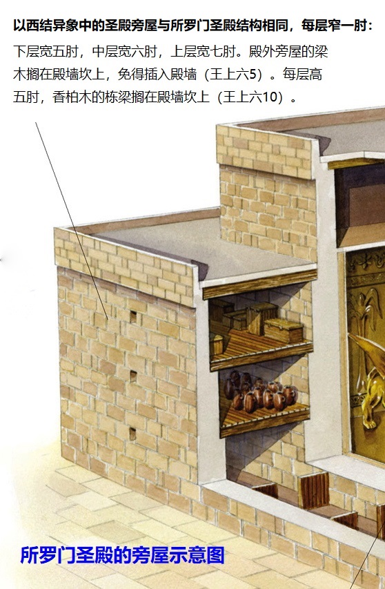 上图:所罗门圣殿的三层旁屋结构示意图,以西结异象中圣殿的旁屋与此结构相同,同样是「越上越宽」(结四十一7),但每层都要窄一肘。