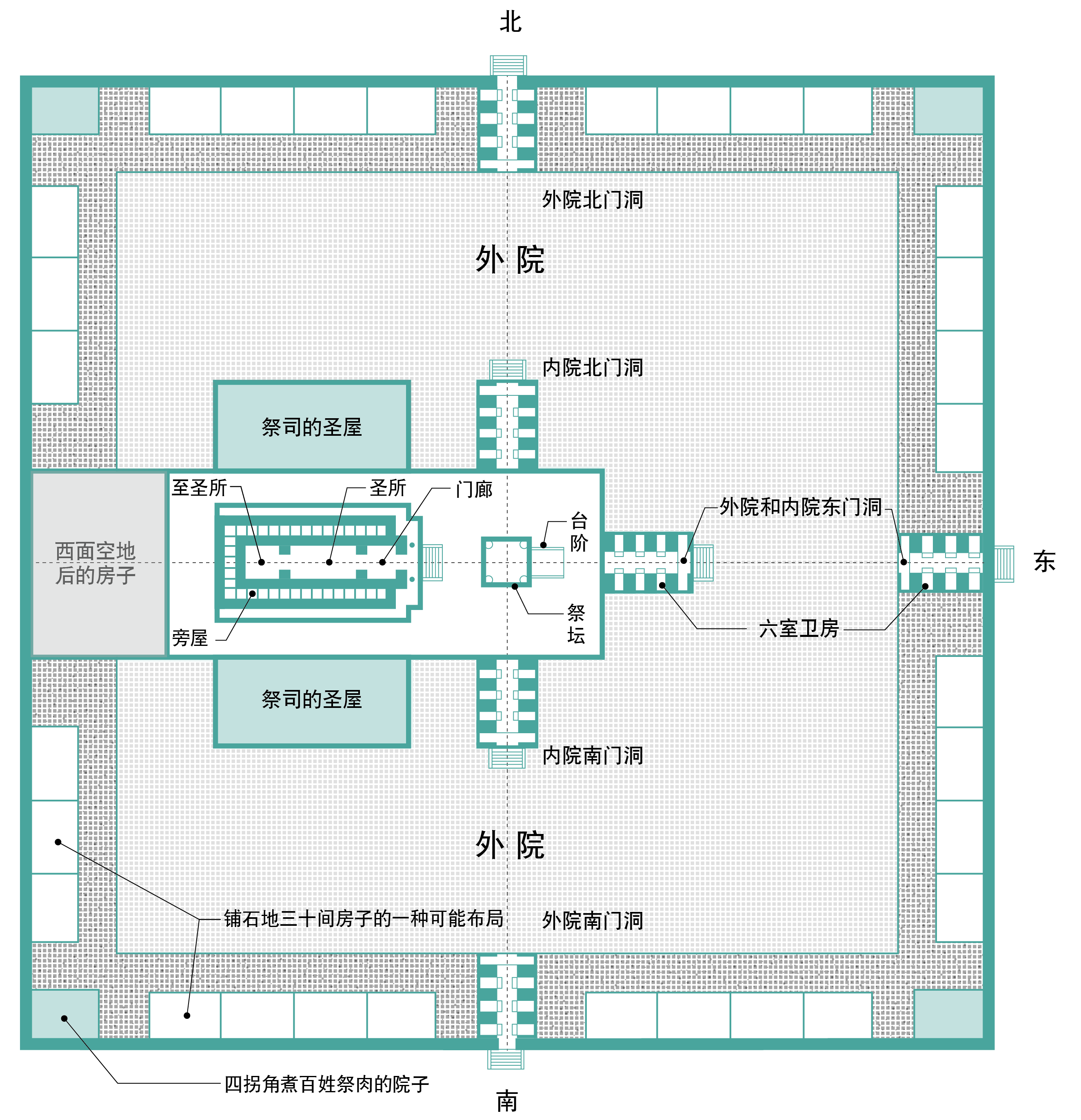 2. 圣殿的房子和空地南北宽「一百肘」(13b),从北到南包括空地宽二十肘(10节)+余地宽五肘(11节)+旁屋外墙厚五肘(9节)+旁屋宽四肘(5节)+殿墙厚六肘(5节)+圣殿内部南北宽二十肘(2、4节)+殿墙厚(5)+旁屋宽(5)+旁屋外墙厚(9节)+余地宽五肘(11节)+空地宽二十肘(10节)。这个尺寸也可以通过圣殿西面的房子南北宽进行验证,包括:房子长九十肘(12节)+两堵墙厚共十肘(12节)。
