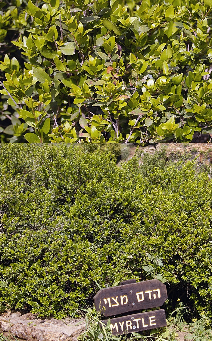 上图:生长于以色列但遗址的香桃木(Myrtle tree),「番石榴树」(亚一8)就是一种过去普遍生长于以色列的常绿香桃木。枣椰树(????,lulav)叶子、 香桃木(???,hadass)枝条、柳树(???? ,aravah)枝条和香橼(?????,etrog)果实,是住棚节四祥植物(Four species,利二十三40;尼八15)。