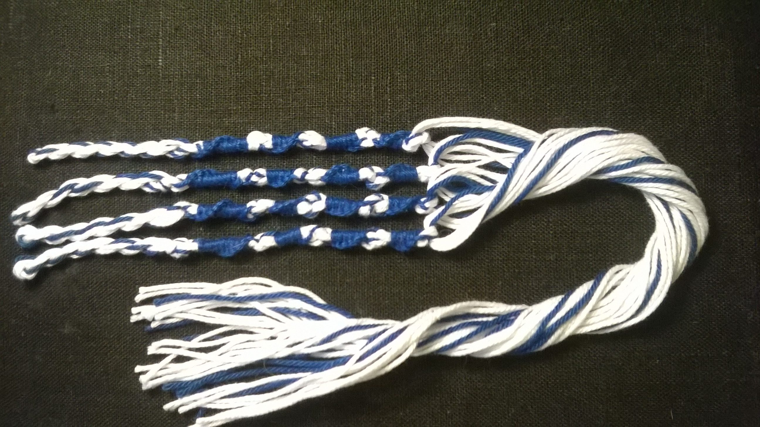 上图:犹太人根据民十五37-40和申二十二12,在衣服下摆佩带的䍁子,提醒自己「记念遵行耶和华一切的命令,不随从自己的心意、眼目行邪淫」。「䍁子」的希伯来文「Tzitzit/?????」数值是400+10+90+10+90=600。每个䍁子都由5个结和8根线组成,5个结代表摩西五经,8根线代表完全。600+5+8=613,象征摩西律法中的613条律例和典章。东欧阿什肯纳兹犹太人(Ashkenazi)的䍁子5个结之间的圈数是7+8+11+13=13*3,是「神是独一」(申六4)的希伯来文数值。西班牙塞法廸犹太人(Sephardi)的䍁子5个结之间的圈数是10+5+6+5=13*2,是「耶和华」的希伯来文数值。