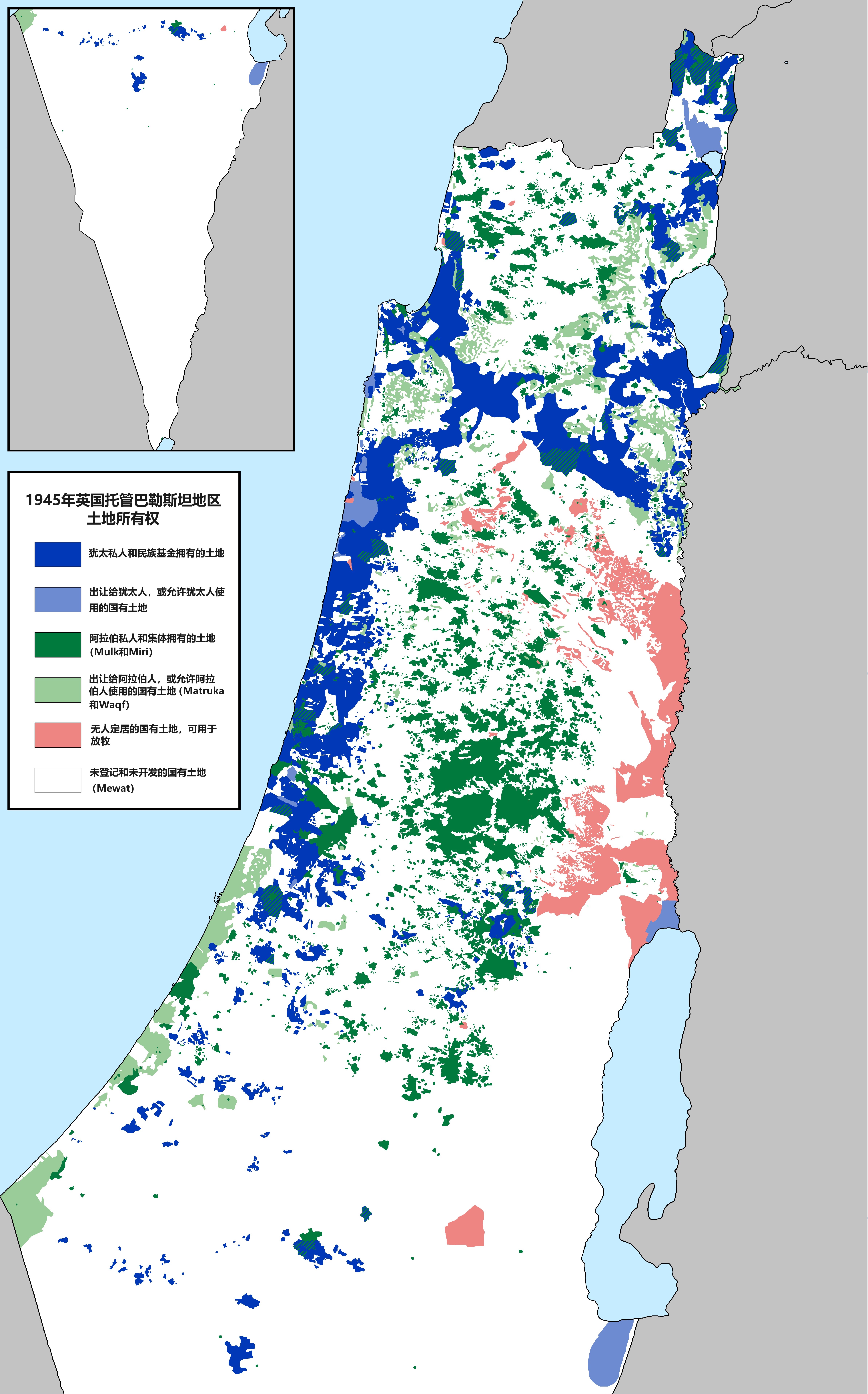 上图:1945年英国托管巴勒斯坦地区的土地所有权,其中犹太人拥有8%,阿拉伯人拥有12%,其余都是国有土地(来源:https://www.reddit.com/r/MapPorn/comments/gcz4zr/comment/fpebrgn/)。1517年以后,巴勒斯坦地区就没有独立的国家,统治者是奥斯曼土耳其帝国。1917年英国托管之后,统治者是大英帝国。巴勒斯坦只是一个地理概念,当地的阿拉伯人和犹太人都是巴勒斯坦人,并没有所谓「巴勒斯坦人收留犹太人」之说。1948年以色列复国之前,犹太人的土地大都是从原奥斯曼帝国的地主手中买来的,拥有合法的所有权证。但阿拉伯人声称,奥斯曼帝国的腐败官员将大片土地登记为自己所有,他们的后代将土地卖给了犹太复国主义者和难民。实际上,奥斯曼帝国的土地分为5种主要类型:
