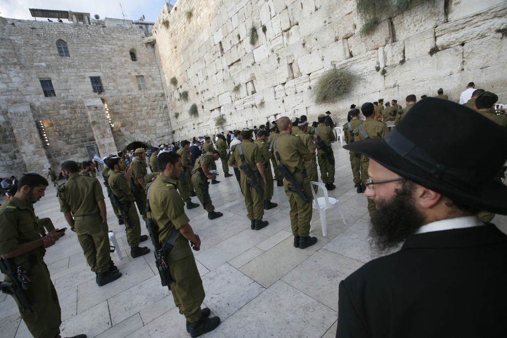 上图:一位极端正统派哈雷迪犹太人在看着一群以色列士兵在耶路撒冷哭墙祷告。在两千年多年的大流散中,散居世界的犹太人与当地民族融合,外貌、语言、习俗、文化各方面都产生了很大的差异。现代犹太人中最主要的三个分支是:阿什肯纳兹犹太人(Ashkenazim,是主后800-1000年移居德国莱茵兰一带的犹太人后裔,使用意第绪语Yiddish,约占70%)、赛法迪犹太人(Sephardim,是1492年被驱逐的西班牙裔犹太人后裔,使用拉迪诺语Ladino,约占20%)、米兹拉希犹太人(Mizrahim,是中东和北非的犹太人后裔,约占10%)。现代以色列73%的犹太人已经世俗化,约27%属于正统犹太教(Orthodox Judaism),主要分为现代正统派(Modern Orthodox Judaism) 和极端正统哈雷迪派(Ultra-Orthodox或Haredi)。