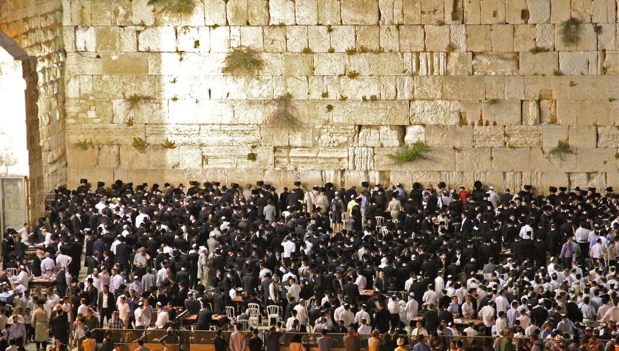 上图:耶路撒冷的犹太人在安息日的晚上在哭墙祷告。安息日从星期五晚上日落以后开始,到星期六晚上天上出现两颗星星时结束。