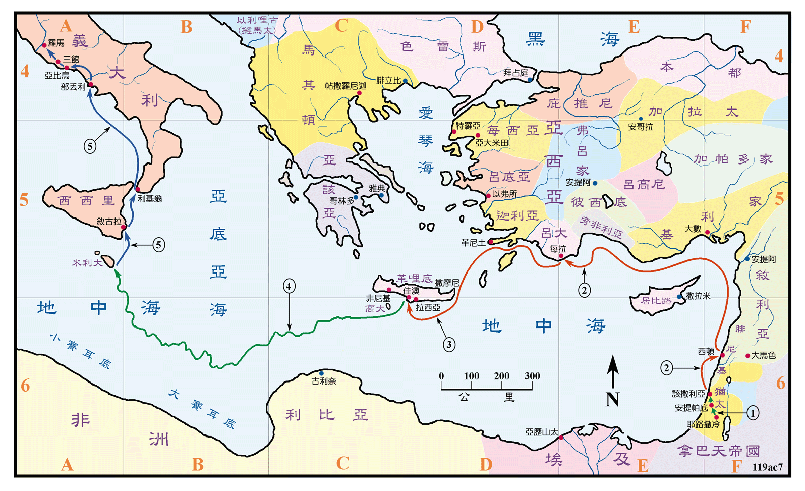 上图:保罗被押往罗马受审旅程:1、保罗在耶路撒冷被捉,送到凯撒利亚(徒二十一27-二十三30);2、在凯撒利亚被囚两年,受审后送往罗马(徒二十三31-二十六32);3、保罗被押乘船经西顿、每拉到了佳澳(徒二十七1-8);4、保罗等在海上历经风浪的危险到了米利大(徒二十七9-44);5、从米利大经叙拉古、利基翁、部丢利,到了罗马,在罗马等待受审两年期间继续传道(徒二十八1-17)。