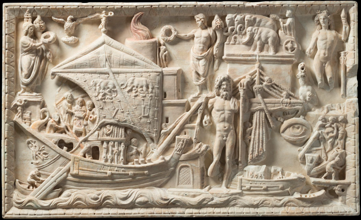 上图:主后2-3世纪的古罗马浮雕(Torlonia relief),描绘了台伯河口北岸的波特斯港(Portus)和货船。