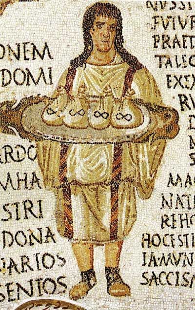 上图:主后3世纪马赛克画上的罗马管家,他捧着几个钱袋子,每个袋子里是1000得拿利乌(Denarius)银币。