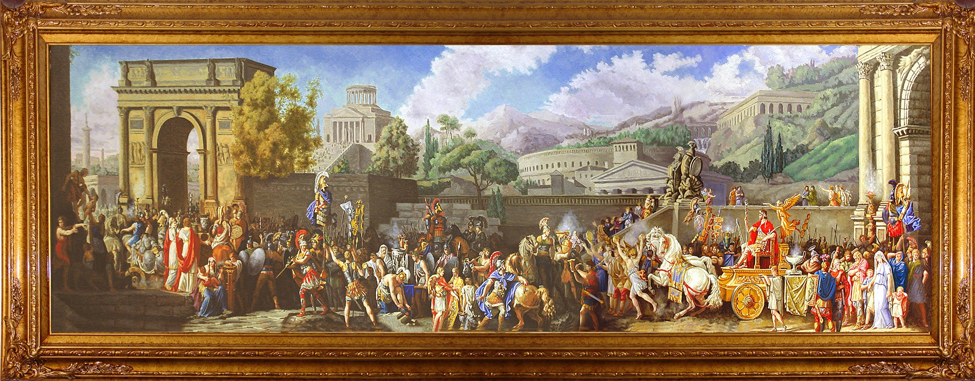 上图:古罗马凯旋仪式(拉丁语:triumphus)。凯旋仪式是古罗马授予获得重大胜利的将军的庆祝仪式,这是罗马人最大且最受欢迎的荣耀。凯旋仪式上的游行队伍一般都非常长,顺序是:元老院元老,号手,车载的战利品,用以献祭的白色公牛,被征服者首领的武器及徽章,被征服者首领及其亲属,其他战俘,凯旋者的扈从,站在战车上的凯旋者本人,凯旋者的已成年儿子及副官、军团长、军事保民官、骑兵队长等,凯旋者的士兵。
