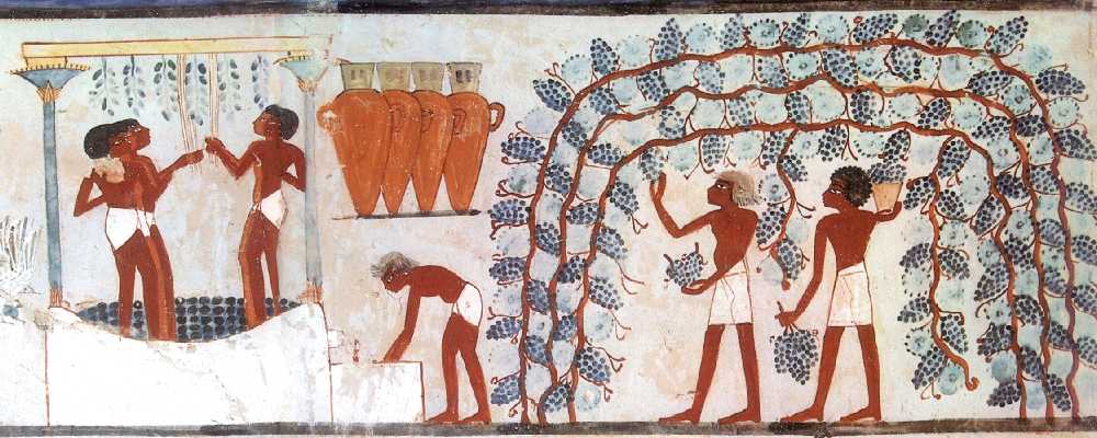 上图:古埃及壁画上的酒榨。酒榨通常是用大石凿成的石槽(赛五2),底端有一个洞,通往下层石槽。工人将收割来的新鲜葡萄倒入上层石槽中,用脚踩踏,葡萄汁经小洞流入下层石槽。圣经常有踹酒过程比喻神忿怒的施行(赛六十三2-3;哀一15;珥三13;启十四19-20;十九15)。