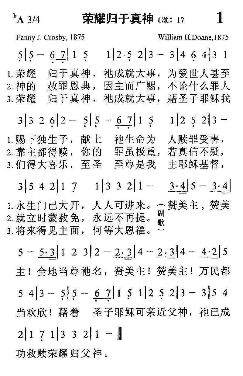 《荣耀归于真神》是写于1875年,由杜恩谱曲。 1952年葛理翰布道团在英国各地布道,有一位牧师建议将这首诗歌编入布道会歌集中,在伦敦布道会中选唱这首诗后,深受信徒喜爱,以后,在整个月的聚会中,几乎每晚大家要唱这首歌。他们回美国后,发现在旧版的诗集中早已有这首诗,但新编的圣诗集中却删去了这首诗歌,于是他们立即把它编入布道诗选中。一首被人遗忘了的美国福音诗歌,由于英国人的热爱,再次在世界各地流行起来。