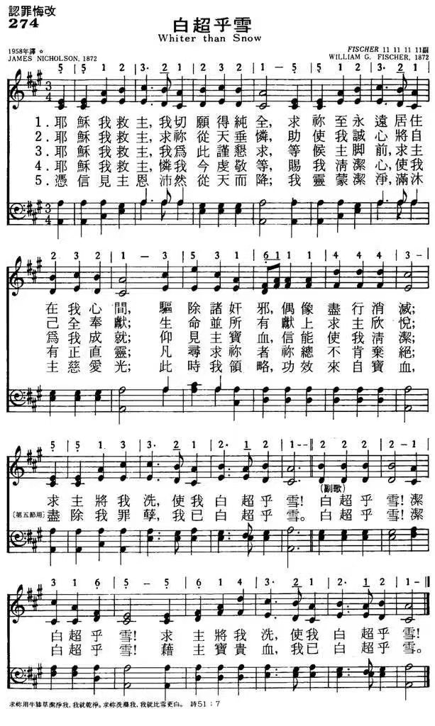 所用的曲调乃费希尔 (事略参阅第214首)所谱,调名为《白超乎雪(WHITER THAN SNOW)》,又称《费希尔 (FISCHER)》。