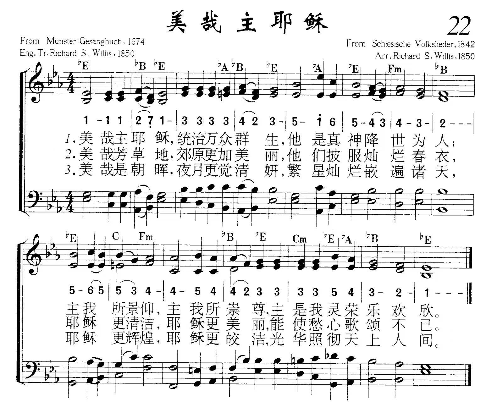 Willis生于美国的波士顿。1841年耶鲁大学毕业后,远赴德国进修5年,于1848年返回美国,并成为专业的音乐评论人。1850年在其出版的刊物《Church Chorals and Choir Studies》中收录这首诗歌《美哉主耶稣》(Fairest Lord Jesus) 。除了这首诗歌外,Willis还为圣诞歌曲《夜半歌声》(It Came Upon the Midnight Clear; 亦译作《圣诞夜歌》)谱曲。《美哉主耶稣》的另外两节歌词由Joseph Augustus Seiss (1823-1904)于1873年翻译完成,但不及Willis的普及。