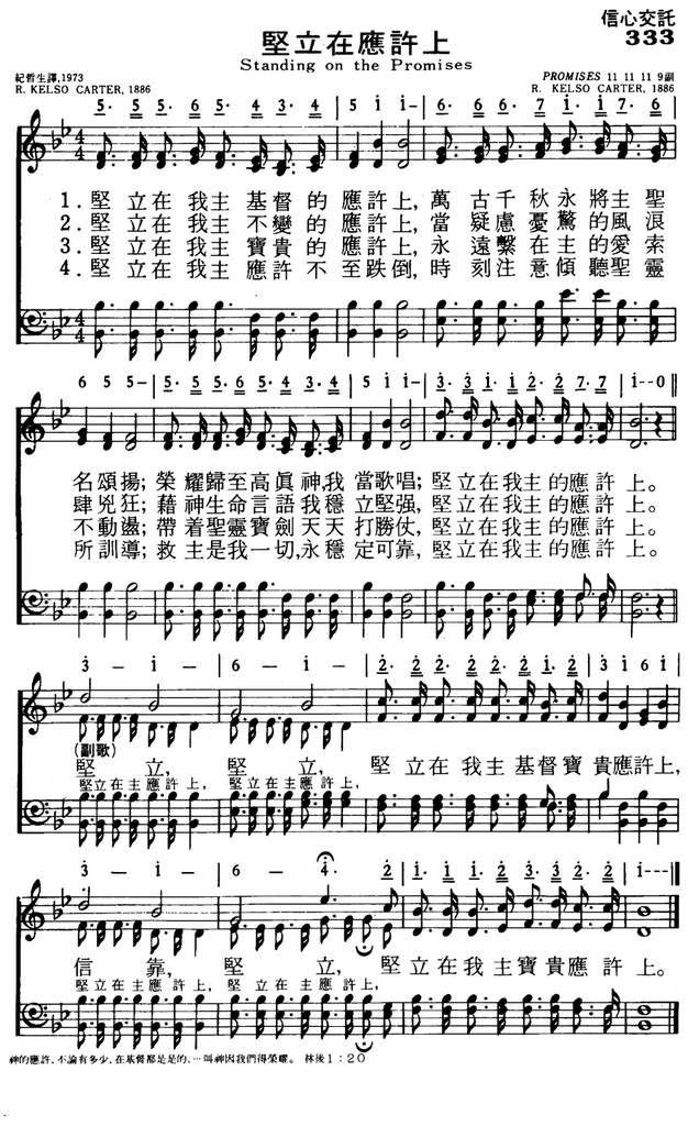 坚立在我主基督的应许上,万古千秋永将主圣名颂扬;
