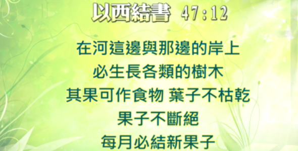 以西结书 47:12 在河这边与那边的岸上必生长各类的树木。其果可作食物,叶子不枯干,果子不断绝。每月必结新果子,因为这水是从圣所流出来的。树上的果子必作食物,叶子乃为治病。”